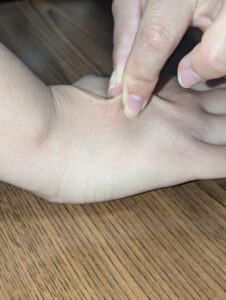 手の甲の皮膚をつまんで、元に戻るのに3秒以上かかると脱水かもしれない、というチェックの仕方です。
