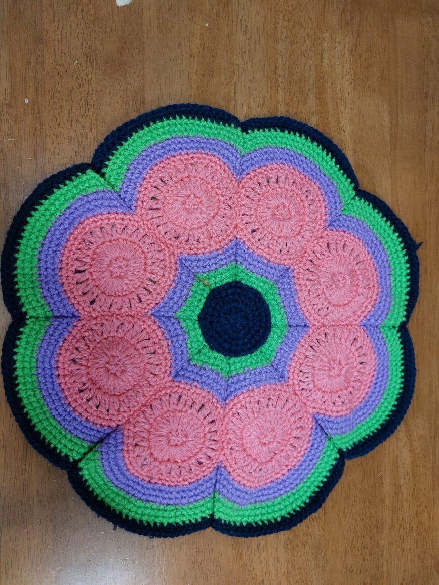 『余った毛糸を、寄せ集めてつくったから』と、おっしゃいましたが、どれも、色のバランスが素敵で、お尻の下にするのは、もったいなくなりました。