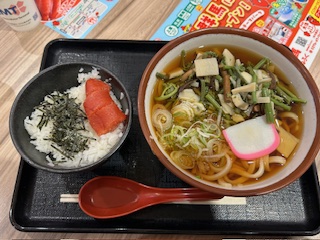 写真は、つい最近、夢の国へ行った帰りのサービスエリアで食べた山菜うどんと明太子ご飯です。